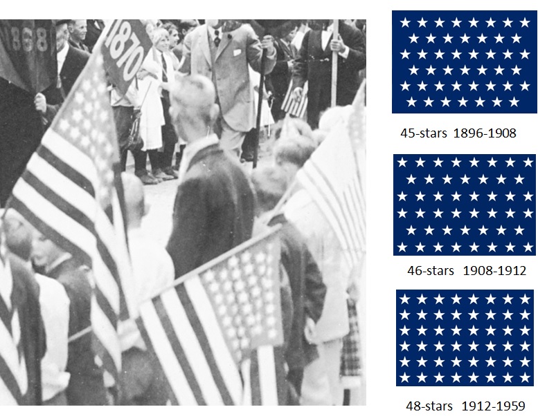 Recently, at my alma mater, Hope College, I tried to help identify the age of a photo. Zooming in on the flag in front, we identified it as a type that only was made from 1908 to 1912. But, before agreeing on that date, we noticed another flag in the background was a post-1912 flag. It seems the cheap Hollanders were still flying pre-1912 flags in a 1916 parade! You can’t blame them, though, because who really wanted Arizona and New Mexico as states anyways?