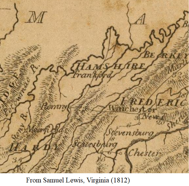 Defining property and maintaining the roads (along with keeping the peace) were the main objectives of county government, in Hampshire and anywhere really in early 19th century America. It is disappointing, given the effort so many spent to keep up the roads, that they seldom thought to record a history of them, when they started, where they went, when they were abandoned, or even how they were funded. Historians of early Hampshire County have to rely on less than convincing maps of the state of Virginia, at fairly low scale. Samuel Lewis’s 1812 map of Virginia shows one road (essentially the present route 50) from Winchester to Romney, and another road running North/South from Moorefield to Frankfort (present-day Fort Ashby). Early mapmakers were concerned with the rivers as much as the roads. They weren’t, always, too concern with spelling. Note “Romny” and “Hamshire” instead of Romney and Hampshire.