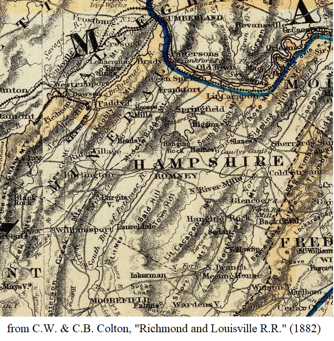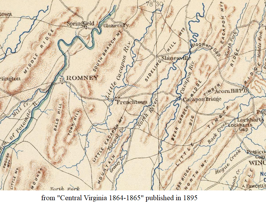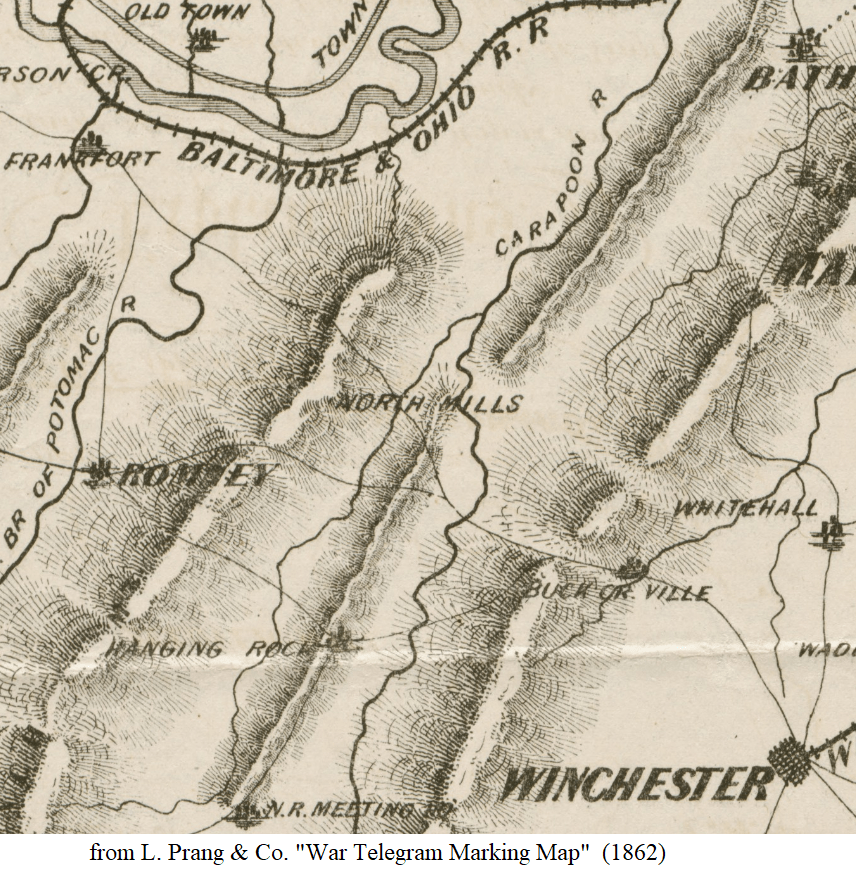 A fury of map-making in and around Virginia occurred during the Civil War, for the obvious reason that two armies were trying to dance around each other without getting killed or lost. This 1862 War Telegram Map of Virginia shows North Mills (North River Mills) and the Carapoon (an obvious typo or misunderstanding of the Cacapon River). I would support a movement to change the name to “Carapoon” if only among the historians in the county. Notice that while rivers and mountains are important features, the Baltimore & Ohio R.R. is also a central feature of concern.