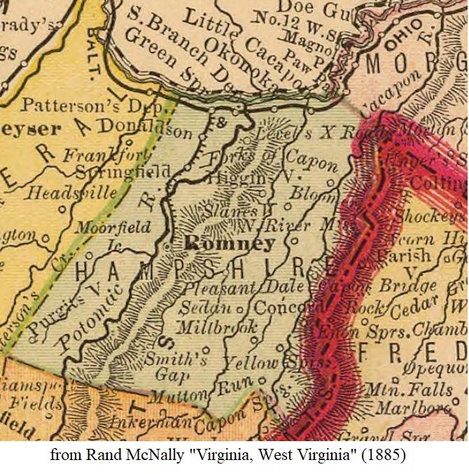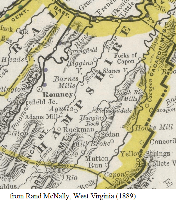 Rand McNally was making maps before there were automobiles, and back in 1889 he (or they, I guess), were not very interested in the roads in Hampshire County for this map of West Virginia. If you needed to get anywhere in Hampshire County at the time, I think you needed to ask the locals which dirt road was best.