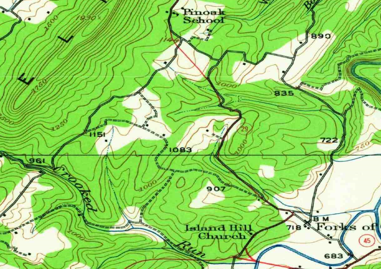 From what I can tell, the earliest topographical surveys of land in the county were made in 1873 and then again in 1894, 1923, 1937, 1943, and 1973, etc., with the most recent published survey from 2019. These surveys are useful for finding the paths of old abandoned roads or the locations of houses on the landscape. Some, like the 1937 topographical survey (show below) is also useful for indicating what land was forested (green) and what land was under cultivation (white).