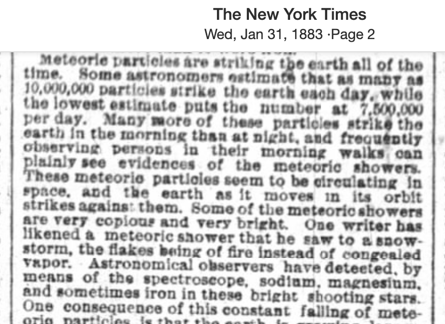 At any rate, I wanted to point out this comment in an article in the New York Times from 1883. The writer says that meteorites are more likely to strike the Earth in the morning than at night. Now, I assume that meteorites come down at relatively the same rate, regardless of the time of day, but that they do increase and decrease in number over the course of the year as the Earth moves around the Sun and into areas of space with more debris. Unless the writer is assuming that the morning lasts for more hours than does the night, I cannot see how someone could reason that more meteorites fall in the morning than at night.