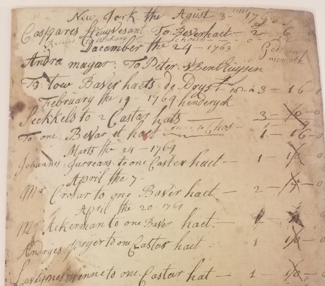 A page of an account book of a 1760s hatmaker in Schenectady, New York (fom the Winterthur Library, Delaware). A bunch of Dutch people ordering beaver hats for their big heads. In the 1760s, many people in Schenectady still spoke Dutch and even “wrote English with a Dutch accent” as it were.